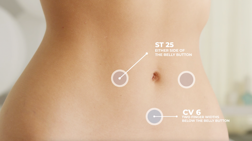 Ease is best used on acupressure points ST25 and CV6. You’ve most likely heard of CV6 before, even if you didn’t know its actual acupressure title. CV6 is lovingly referred to as, “The Poop Button.” Located just 2-3 finger widths below the navel, CV6 is an access point that when stimulated with Ease, quickly gets your bowel movements moving. This natural reaction in the